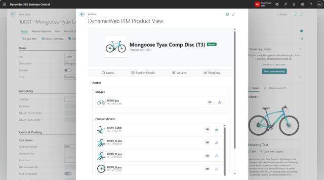 Vanuit de Business Central-artikelkaart krijgt u toegang tot een PIM-weergave met uitgebreide productdetails, gerelateerde artikelen en digitale assets die anders niet beschikbaar zijn in Business Central.